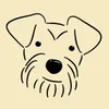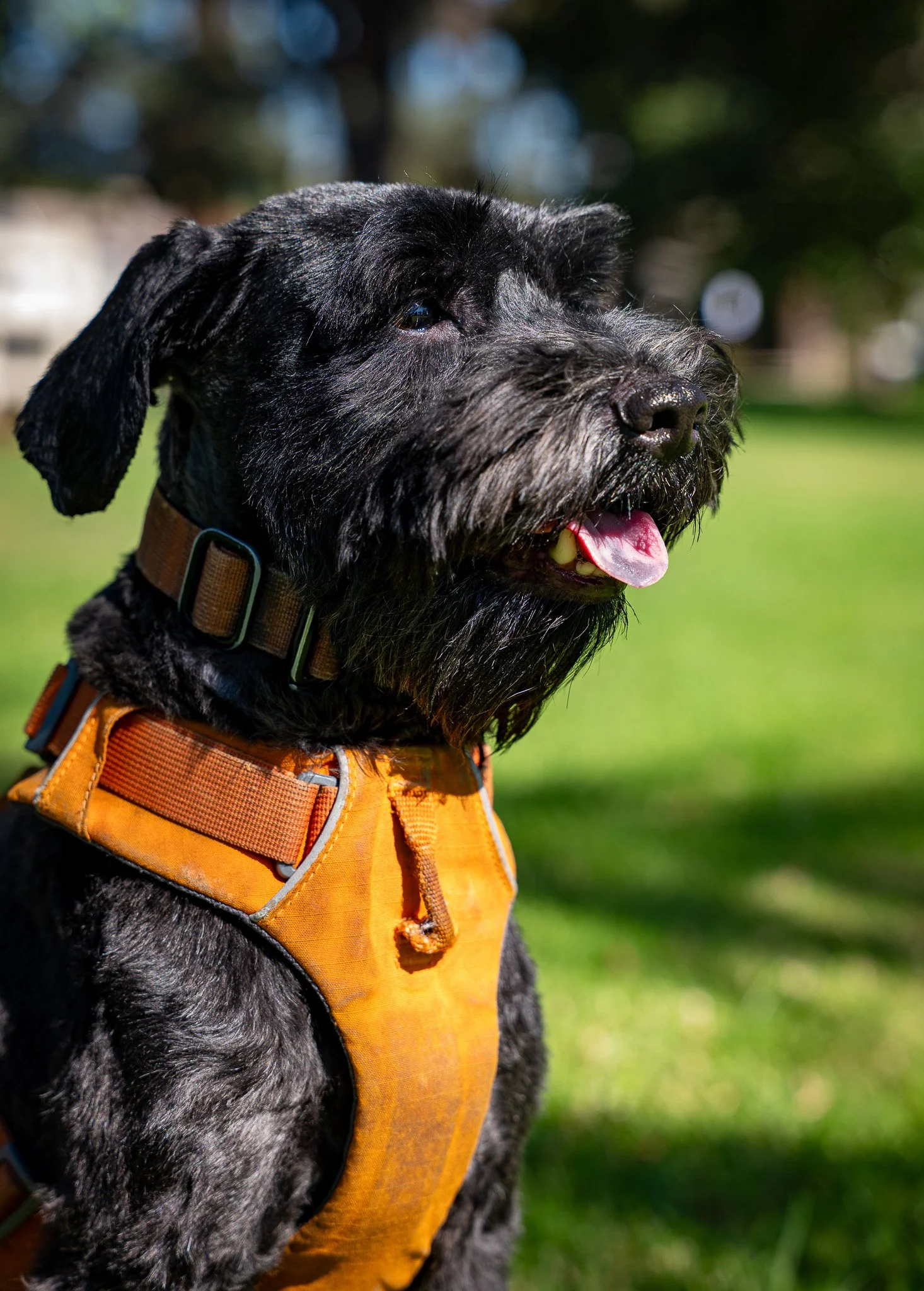 Close-up of a black dog with a beard, wearing an orange harness outdoors on a sunny day, with trees and green grass in the background. View fullsize