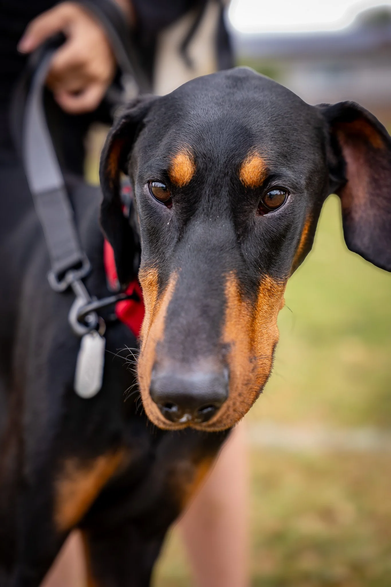 Close-up of a black and tan dog, likely a Doberman, wearing a red collar, standing on grass in a park with person in the background.
